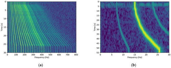 (a) FFT waterfall illustrating the response as rotor speed increases; (b) A detailed view of the primary frequency response used for UAV classification.