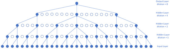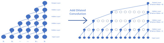 However, such a TCN structure limits the receptive field, requiring an unlimited number of network layers to expand the receptive field, which in turn brings a series of problems such as gradient explosion, overfitting, and inefficiency. To address this, the TCN network incorporates dilated convolutions, which expand the receptive field without increasing computational complexity. The receptive field of each layer increases exponentially with network depth through the progressive increase in the dilation factor. Dilated convolutions effectively extend the receptive field of the network model and improve its performance. As a result, the network can obtain more data information for analysis, thus better learning the global features of electrical appliances when processing power signals. A larger receptive field allows the model to capture more effective information, enhancing its capacity for data learning and analysis, and generating more accurate predictive results. The structure is illustrated in the following Figure 2: