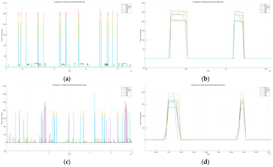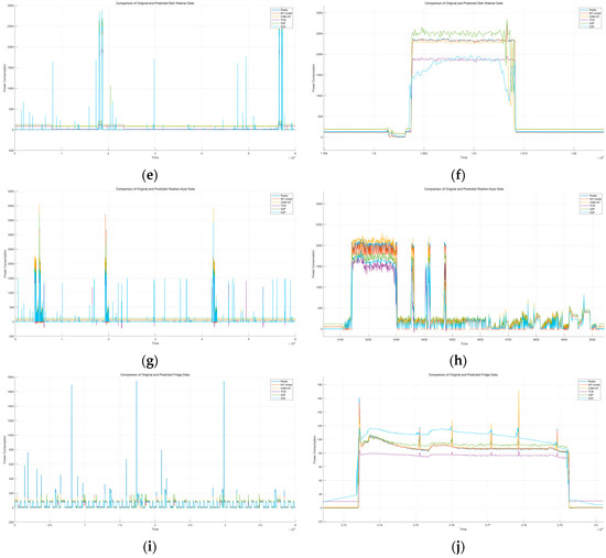 Figure 5. Disaggregation diagram. (a) Overall output diagram of kettle. (b) Detailed section of output for kettle. (c) Overall output diagram of microwave. (d) Detailed section of output for microwave. (e) Overall output diagram of dishwasher. (f) Detailed section of output for dishwasher. (g) Overall output diagram of Washer–dryer. (h) Detailed section of output for washer–dryer. (i) Overall output diagram of fridge. (j) Detailed section of output for fridge.
