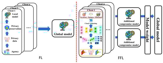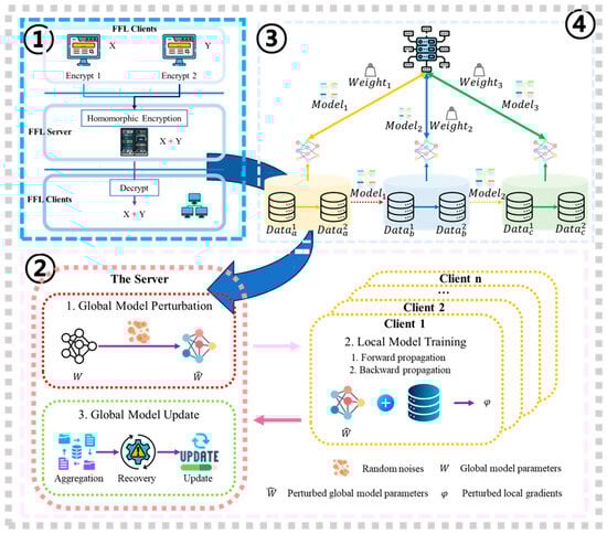 In FFL, HE [36] is used to ensure that each participant’s data are processed fairly and analysis can be performed without the risk of sensitive information leakage. Among the current HE methods, Fully Homomorphic Encryption is relatively more efficient and supports larger ciphertext sizes [37]; however, it is a slow process because of the large amount of computation required, whereas Partially Homomorphic Encryption is less efficient and supports smaller ciphertext sizes; however, it is a fast process and requires less computational power [38]. Jin et al. proposed FedML-HE, the first practical FL system with efficient HE-based security model aggregation, which significantly reduced the computation and communication overhead during learning by selectively encrypting sensitive parameters while providing customizable privacy features [39].