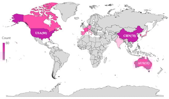 The purple mark on the map in Figure 6 indicates the distribution of FFL authors. Countries that received scores higher than 5 include the United States (80), China (78), Australia (11), Singapore (10), Republic of Korea (9), Canada (8), Great Britain (8), France (8), Israel (1), Sweden (1), Türkiye (1) Italy (1), and Denmark (1).