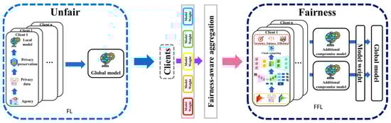 Measurement Bias occurs due to errors in the data collection process [12]. Sampling Bias occurs when a dataset does not adequately represent the entire population [17]. If data from a specific group are oversampled or omitted, it can bias the model’s ability to generalize. An aggregation Bias can occur during the aggregation of models learned from multiple clients [18]. If the data distribution of each client is different, the data from a specific client may have a greater impact than data from other clients during the central aggregation process. These traditional sources of bias should be considered in the design of FL systems. If they are not properly managed through data collection, processing, and model-learning methods, they can result in unfair predictions or decisions.