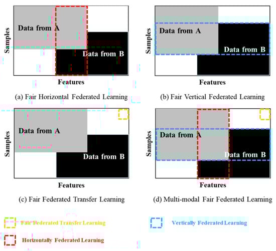 The FFL data-partitioning method is a differentiated approach that prioritizes fairness in FL. As shown in Figure 8, based on the different distribution patterns of data samples and feature spaces, FFL is divided into four categories: fair horizontal federated learning, fair vertical federated learning, fair federated transfer learning, and multimodal fair federated learning.