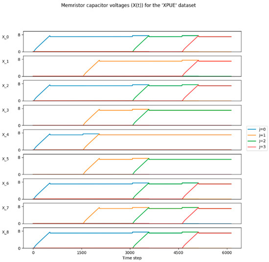 Regarding memristor state dynamics, the state of the memristor is governed by the voltage across the capacitor , which evolves according to the current through the memristor. The capacitor’s behavior follows Equation (11):