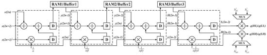 Multi-level DWT architecture has also been extensively researched. Mohanty [20] proposed a line-based parallel lifting modular and pipelined architecture, effectively obviating the requirement for lines and frame memories. However, this design results in a critical path delay (CPD) of , where represents the delay of an adder and signifies the delay associated with a multiplier. Wu [21] utilized a CSD multiplier to lower the critical path delay to , though it complicates the internal structure and control signals. Zhang [22] developed a parallel architecture integrating first-stage unfolding and internal semi-folding, combined with folding, to achieve synchronization with the rate and high throughput requirements of three-level DWT. However, this architecture lacks flexibility in modifying parallelism and DWT levels. Furthermore, when managing multi-level DWT with a high number of levels, Refs. [21] and [22] both encountered the issue of multiple clock domains. This results in a structure that fails to reach optimal efficiency, consequently consuming additional clock cycles. Hu [23] proposed a scanning method based on overlapping stripes and developed a scalable pipelined multilevel DWT architecture, which eliminates the need for frame memory, yet the seven-pixel overlap in scans significantly increases the required input RAM size.