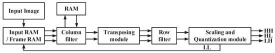 The overall architecture of the 2D DWT is presented in Figure 6, and all levels of DWT are predicated upon this overall architecture. Input RAM stores the input image and frame RAM saves the components from a low level, while column and row filters execute the lifting process. Based on the sequence of data input, the column filter needs temporal memory for intermediate variables and the row filter merely requires a two-unit buffer. The transposing module rearranges and synchronizes the L and H components from the column filter. Lastly, the scaling and quantization module scales and quantizes the data, obtaining the final DWT results with redundant precision removed. These results are then used for subsequent encoding in JPEG2000.