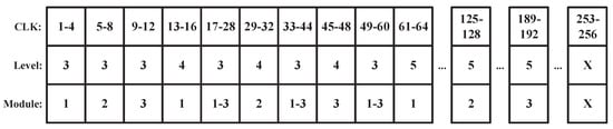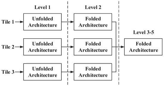 For third-level and subsequent DWT, the indivisible nature of the folded architecture necessitates an alternative strategy. To address this challenge, a novel multi-level DWT architecture that matches the required throughput is proposed, as depicted in Figure 7. The first and second level both employ a three-way parallel architecture. For 3–5 level DWT, only one folded architecture is deployed, which can process components from three tile blocks by timing adjustments as depicted in Figure 8.