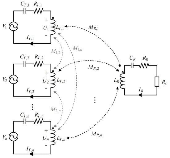 Figure 1 shows the equivalent circuit model of the MTSR-WPT system with series compensation capacitors, which contains n transmitters and one single receiver. In the k-th transmitter loop, represents the open circuit voltage of the power supply. and represent the equivalent resistance and compensation capacitance of the transmitter circuit. is the inductance of the transmitter coil. represents the current of the transmitter circuit. represents the voltage of the transmitter coil. and represent the equivalent resistance and compensation capacitance of the receiver circuit. is the inductance of the receiver coil. is the load resistance. represents the mutual inductance between the i-th and j-th transmitter coils, and represents the mutual inductance between the k-th transmitter coil and the receiver coil.