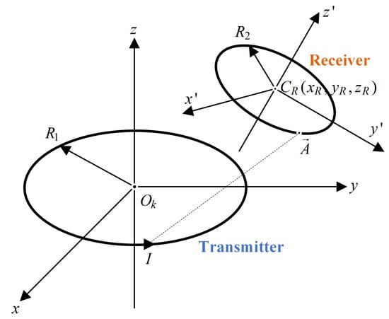 To further investigate the relationship between the position of the receiver coil and mutual induction , assuming the relative position of the k-th transmitter coil and the receiver coil is shown in Figure 2. and are the radii of the transmitter and receiver coils, respectively. is the center of the receiver coil, and the receiver coil is parallel to the plane . The current in the transmitter coil is .
