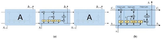 In a single unit, , , respectively represent the input, output, and unit state at time t. Circular nodes represent pointwise operation. Rectangular nodes represent neural network layers. The three gates of LSTM are composed of circular and rectangular nodes, which are forget, input, and output gates. As shown in Figure 3b, the information flow within a single unit at time t is as follows: Firstly, based on the previous hidden state and the current input variable , the forget gate determines how much long-term memory is inherited, with a ratio of . Secondly, the input gate selects new information to be stored in the LSTM’s memory with a ratio of . Then, the current unit state is calculated. Finally, the output gate selectively outputs a new hidden state based on and the selection rate . The derivation between these values is as follows: