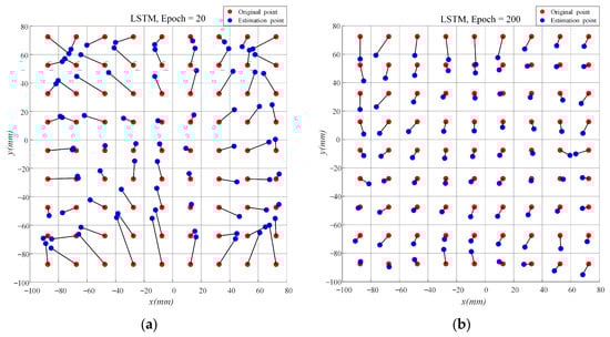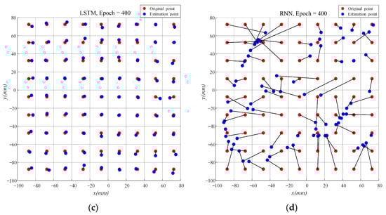 Figure 9a–c respectively show the estimated positions of the receiver coil by the model in the early (Epochs = 20), middle (Epochs = 200), and late (Epochs = 400) stages of the training process. It can be seen that the estimation error of the model significantly decreases with the increase in epoch. It is evident that the LSTM-based estimation model exhibits higher output accuracy for positions closer to the center of the transmitter. Figure 9d shows the estimated positions of the receiver coil when replacing the model input layer with RNN. The error is the average Euclidean distance between the estimation point and the original point. The output errors of different models under various epochs are shown in Table 3. The estimation error of the model with RNN is much higher than the model with LSTM. Therefore, the proposed LSTM-based method is beneficial for improving the accuracy of the position estimation model.