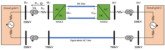 With the continuous growth of the proportion of new energy and the rapid development of flexible transmission technology, regional power grids have gradually broken the previous relatively independent mode of operation and realized the “soft connection” between power grids through the application of power electronic devices [23]. This “soft connection” technology allows the exchange of active power between grids under normal operating conditions, which significantly improves the load balancing capacity, power supply capacity, and overall reliability of the grid. This model facilitates the effective coordination of the various regions of the grid, enhances the overall stability of the system, and improves the responsiveness to unforeseen situations.