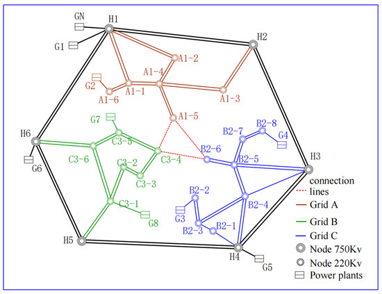 The outer ring of regions A, B, and C is networked at 750 KV voltage level, and the inner ring is interconnected at 220 KV voltage level. Assuming that the internal areas A, B and C are supplied by 220 KV AC interconnection, the power system current distribution is shown in Figure A1 in Appendix A.