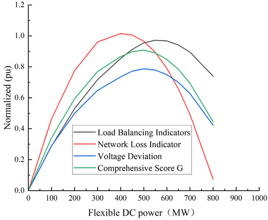 Curve fitting is performed on the calculation results, and the results are shown in Figure 3. With the increase in the flexible DC power, the values of the indicators show the trend of increasing and then decreasing, but the turning point power is different. Among them, the flexible DC power with the smallest network loss ranges from 300 to 600 MW, which reflects the result of the joint effect of the network loss of the sending end and the receiving end zoning.