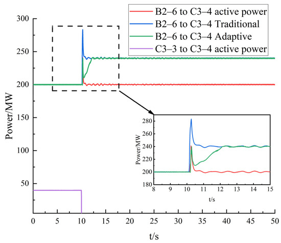 It is assumed that an N −2 short-circuit fault occurs in the line between node C3–3 and node C3–4 during the 500th cycle of the grid’s fundamental frequency, and the circuit breakers on both sides operate in the 5th cycle until the fault is cleared. Before the fault occurred, node C3–3 delivered 79.4 MW of active power to node C3–4 through the double circuit. After the fault occurs, the circuit breaker of the line between node C3–3 and node C3–4 trips, and zones A and B maintain the active power balance at node C3–4 by generating an additional 79.4 MW of power in an emergency. The power fluctuation curve is shown in Figure 4.
