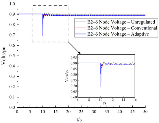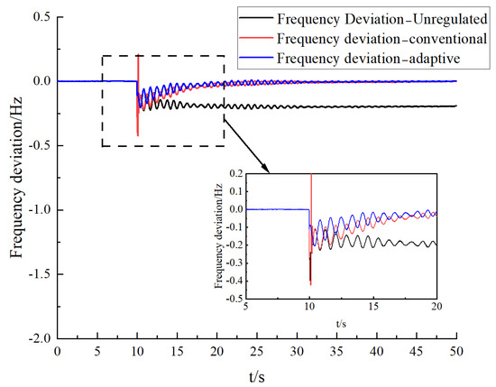 Simulation results show that the adaptive power regulation strategy proposed in this paper can effectively reduce the system overshooting amount and overshooting time and enhance the emergency response capability of the system when a fault occurs. In addition, the measure of increasing reactive power when increasing active power can effectively maintain the balance of bus voltage and prevent the voltage from dropping too deeply.