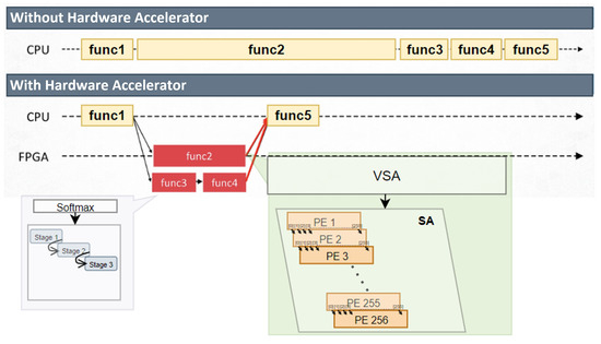 A transformer consists of an encoder and a decoder, which consists of Multi–Head Attention (MHA) and a Feed–Forward Network (FFN). Both operations have enormous matrix operations [4,5,6,7,8]. However, as time passes, the parameters that must be handled in large language models (LLMs) are increasing, reducing their computational speed and power efficiency. AI hardware accelerators are needed to accelerate operations that require parallel processing, such as matrix operations. Figure 1 illustrates the process difference with and without a hardware accelerator. Function 1 and function 5 are the processes of exchanging data from the CPU to the accelerator, and functions 2–4 are the computational processes in the accelerator, and parallel processing is possible [9,10,11,12]. Therefore, we aim to implement Transformer hardware accelerators to reduce voice assistant applications’ computational speed and power consumption. Our proposed accelerator was implemented and validated on a Field–Programmable Gate Array (FPGA). The proposed Scalable Transformer Accelerator Unit (STAU) has the following three characteristics.