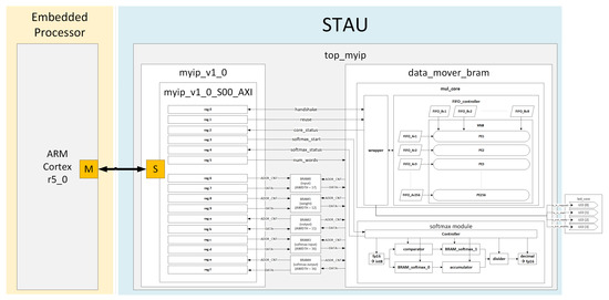 Figure 2 illustrates that the entire structure is divided into the STAU accelerator and the processor parts. We implemented the STAU accelerator with Xilinx VMK180 board’s xcvm1802-2msevsva2197-FPGA, and the embedded processor used the built-in Arm Cortex-R5. The STAU accelerator part consists of the VSA, softmax, and quantization modules, and the processor part is responsible for control and data preprocessing. The Arm Cortex-R5, an embedded processor, reuses the STAU accelerator. The accelerator and the processor communicate using sixteen AXI4-Lite interface registers. The handshake signal controls the BRAM read/write and verifies it by connecting it to an external LED. The design incorporates a FIFO interface at the input terminal of the VSA. The FIFO interface divides the inputs into rows and feeds them to the VSA after a one-clock cycle delay while simultaneously dividing the weights into columns and entering them in parallel into the VSA. During this process, BRAM read and FIFO write operations occur simultaneously. When data are input by row in the VSA, continuous memory access increases the bandwidth efficiency and hardware resource utilization. A disadvantage is that waiting is required for the entire row of input data to be prepared. However, since the input data do not change in MHA’s Q, K, V, and FFN operations, and only the weight changes in Transformer operations, the VSA can calculate without waiting for the next operation due to the nature of the VSA that receives weight in parallel by column. Therefore, the input value sent from BRAM0 to the FIFO interface is maintained, and only the weight value sent from BRAM1 to the FIFO interface is updated. By minimizing data movement, memory stalls are reduced. Reuse signals initialize the FIFO interface when the input value needs to be changed. When the reuse signal enters the FIFO interface, the register that counts the data within all FIFOs can be initialized to 0, and FIFO can write the newly entered value from BRAM. It is also a flexible structure that takes the word count as input and changes the clock cycle of all modules.
