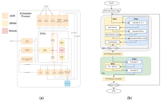 Figure 3a illustrates the hardware structure in Multi-Head Attention. We designed the softmax module to handle all operations in the STAU accelerator without any operations from the processor. In addition, the processor preprocesses the data to a constant size according to the VSA structure. Figure 3b illustrates the data flow of the Transformer encoder. The processor minimizes overheads by instructing the next task to start before the output of the current task is complete [14]. The processor also handles ReLu and Residual Connection rather than iterative operations. ReLu and Residual Connection are not iterative and take up very little operation time. The BERT, GPT, and ViT models use GeLu functions rather than ReLu as activation functions of multilayer perceptron structures [15]. Therefore, we made it possible to use activation functions for various models by modifying only the software running on the processor.