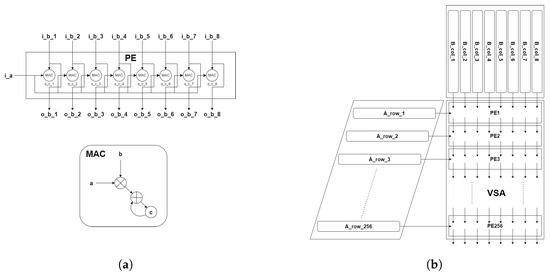 The VSA is more parallel than conventional systolic arrays and has a variable structure in which the latency decreases as the word count decreases [16,17]. Figure 4a illustrates a Processing Element (PE) designed to reduce clock cycles. Input data A are connected parallel to all Multiply–Accumulate (MAC) structures of the PE. Figure 4b illustrates a pipeline structure where PEs are instantiated up to the maximum word count [18,19]. The weight values are input in parallel as B and flow from the first to the second PE over consecutive clock cycles. In other words, the structure is a hybrid 2D PE array that utilizes the existing systolic array structure for input values while parallelizing the method of loading weights into the PE [20]. It operates sequentially from PE1 to PE256, with a maximum capacity of 256 PEs. At maximum operation, all PEs function simultaneously over 256 clock cycles. In multiplication, a general systolic array requires a clock cycle of , whereas a VSA requires . The VSA utilizes a finite state machine (FSM) to control its operations efficiently and reduce clock cycles. For example, it compares the word count and run count to terminate computations early and also ends the output process prematurely. MACs are configured row by row within the higher-level PE module to control PE operations based on the word count. This configuration has the advantage of having fewer idle MACs compared to traditional systolic array structures. The total number of MACs corresponds to the number of elements in the output matrix. This means that if a sufficient area is available, more weight values can be input in parallel without increasing the clock cycles, implying that performance can improve based on the FPGA’s resource utilization. Considering the area constraints of the FPGA, the proposed VSA is designed to perform matrix multiplication operations with a size of , where n denotes the word count.