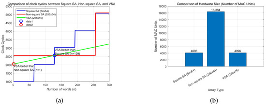 Assuming that the hardware size is proportional to the number of MAC units, we compared the proposed VSA with the existing systolic arrays [21]. We compared the clock cycles of the most critical operations, namely the Q, K, and V calculations in MHA, assuming two of these proposed units are placed in parallel. As a result, the proposed VSAs consume fewer clock cycles than 129 words, as shown in Figure 5a, compared with a square SA of equivalent hardware size. It is also an efficient linear structure when processing matrices of various sizes. While a non-square SA may be faster at higher word counts, the proposed unit strikes a more appropriate trade-off considering hardware size, as shown in Figure 5b.