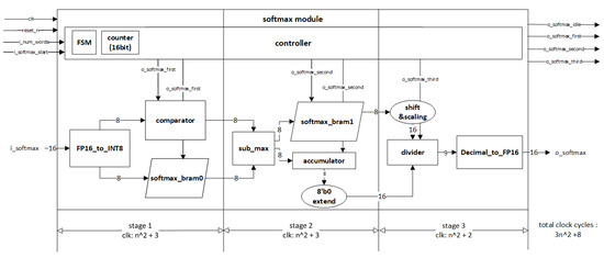 Since softmax can be seen as a kind of normalization, it starts with a module that converts 16 floating-point values into INT8 format by rounding [24]. It operates on each row of an -sized matrix. As the input is received serially and the row vector size varies with n, an counter is used to distinguish each row dynamically. The radix-2 softmax operation requires raising each element in a row and dividing by the sum of all values in that row. A reference point is needed to perform this calculation with shift operations instead of LUT. This necessitates that the comparator first determine the maximum value for each row. After finding the maximum, each element in the row is subtracted from the maximum. This results in the maximum element having its MSB set to 1 without shifting, while the other elements are right-shifted by the difference between the maximum and their value. The initial input values are written to the BRAM to subtract each element from the maximum. These values are then read in the subsequent stage to compute the differences between the maximum and each element. The results of this subtraction operation are required to calculate the denominator of the softmax through accumulation. Thus, these values are first written to the BRAM and then read in the next stage for accumulation. Consequently, as shown in Figure 6, the hardware architecture requires three stages, which are implemented in a pipelined manner. Finally, the integer values obtained through division are converted back to floating-point 16 format to enable further matrix operations. The total clock cycle taken by this module is .