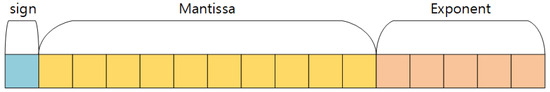 Traditional Transformer algorithms perform calculations using 32-bit floating points. In this paper, we propose a novel 16-bit floating-point format tailored for Transformers [25], which differs from the traditional IEEE754 format [26]. The analysis using MathWorks MATLAB R2023b showed that the input and weight values did not exceed , mainly distributed between −1.0 and 1.0. In floating-point representation, a 5-bit exponent can represent digits between and . Considering overflow, we propose a structure with a 1-bit sign, a 10-bit mantissa, and a 5-bit exponent, as illustrated in Figure 7. Quantization techniques improve computational speed and increase memory efficiency, but can result in fine losses of the learned weights. In the multiplier module, the input value is adjusted between and to ensure that the product does not exceed the expressible range of digits. In the adder module, input values are calibrated to avoid maximum or minimum values, ensuring continuous accumulation capability. This method ensures that normalization is not required in the final stages of MHA and FFN, maintaining accuracy without exceeding the expressive range. Thus, the clock cycle is significantly shortened by omitting the normalization step with the second largest delay time [27].