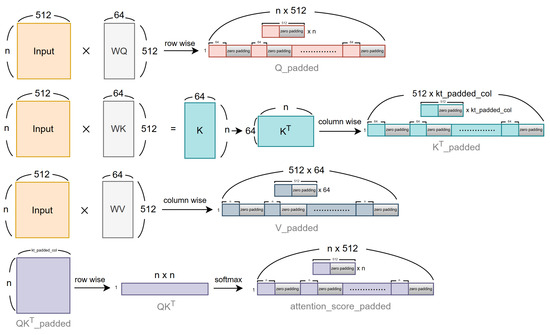 In the MHA mechanism of the Transformer, the internal dimensions (i.e., the number of columns in the first matrix and the number of rows in the second matrix) for the operations and are smaller than the dimensions that the matrix multiplier can handle, making these operations unfeasible. Although the matrices are large, matrix multiplication in the STAU is much faster than the processor, so zero padding is applied to fit the size of the matrix multiplier [32]. Figure 8 illustrates how zero padding ensures that always results in a size of , where m is a multiple of 8, the number of columns in the VSA’s output. Additionally, data are stored in vector rather than array format to prevent extra memory allocation and improve compatibility with bus interfaces, providing immediate access to the following VSA inputs. Because the data are extensive and use DRAM, storing them in vector form and using the output directly as the input can efficiently utilize memory bandwidth. Continuous memory access enables DRAM burst transfer and improves cache hit rates [33]. It also reduces latency by minimizing data movement between memory and STAU. If the VSA output can be stored sequentially without interruption, it will be received directly in vector format. If not, the data will be stored in 2D arrays to prevent memory errors during processor–accelerator communication, then reshaped and stored as vectors.