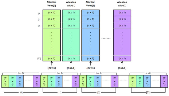 Figure 9 illustrates the method of dividing the attention value matrices computed from each head in MHA and concatenating them in vector format. The 2D array format of each head is directly concatenated to the vector format, accessing the subsequent VSA input immediately. Zero padding is employed when the internal dimensions of the multiplication are smaller than the VSA’s dimensions. However, processing becomes more complex when these dimensions exceed the VSA’s capacity.