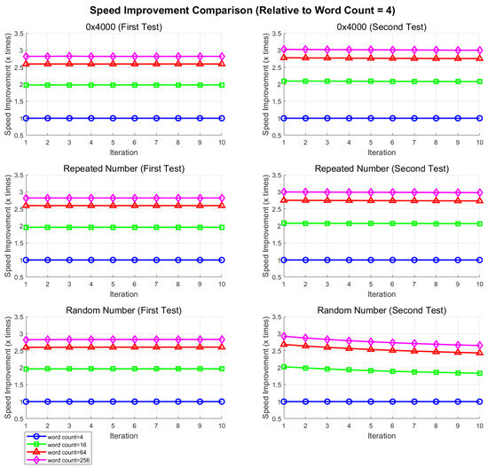To validate the results, we first modeled a matrix multiplier based on a quantization algorithm designed in Verilog HDL in C language and executed it on an ARM processor. The results obtained from the VSA were consistent with those from the software model executed on an ARM processor. We first calculated the ratio of processing speeds between SW and HW implementations for word counts of 4, 16, 64, and 256. Then, we determined the relative speed increase for each word count compared to the baseline performance at four words. The VSA, supporting parallel processing, demonstrated significant speed improvements as the word count increased. Figure 11 illustrates performance across three cases, each tested twice. On average, the VSA achieved up to 2.87 times faster processing speed at the maximum word count than when using four words.