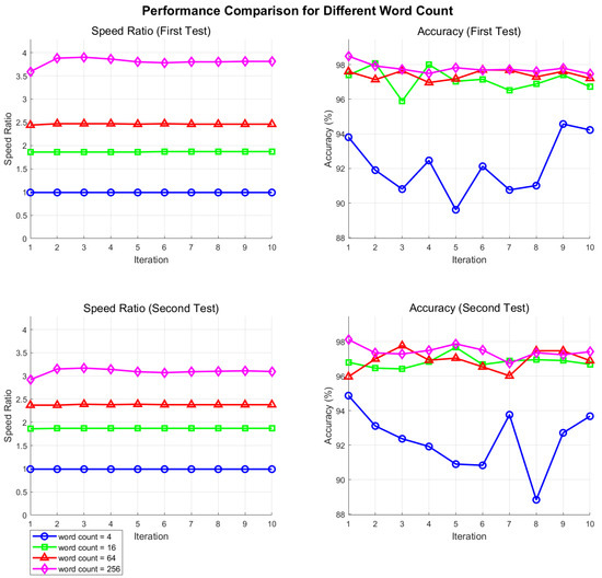 To validate these results, we optimized the encoder model in C language and executed it on an ARM processor. We compared the speed of the Transformer encoder operations designed with an embedded system and calculated the differences between adjacent columns in each result row. We then computed the mean squared error (MSE) to assess similarity [35]. We conducted the test twice, using 10 different random seeds with 10 iterations per seed. Figure 12 illustrates that processing speed and similarity improve as the word count increases due to the larger sample size. The speed increased by an average factor of 3.45 at the maximum word count, while the accuracy reached an average of 97.60 percent.