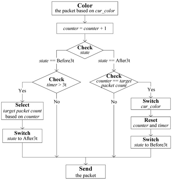 Block generation is performed by the upstream node at its egress port. For each egress port, a counter and a timer are maintained to record the current packet count and the current duration of the block being generated. The workflow of block generation is shown in Figure 3. It begins by coloring the packet based on the variable , the value of which is either 0 or 1. Then, the counter is incremented by 1, and the state of the egress port is checked. Each egress port has two states called Before3t and After3t, depending on whether the current duration of the block being generated has exceeded .