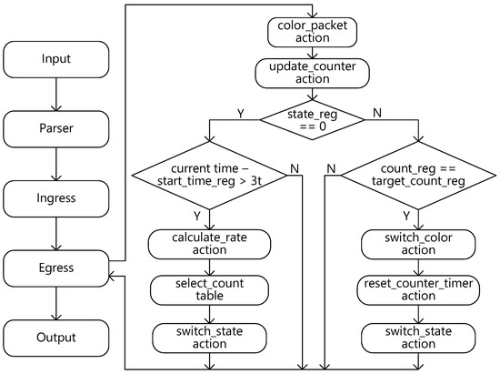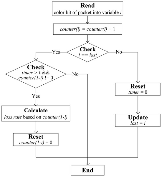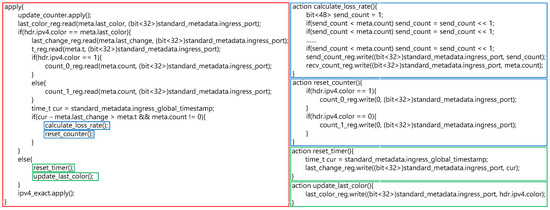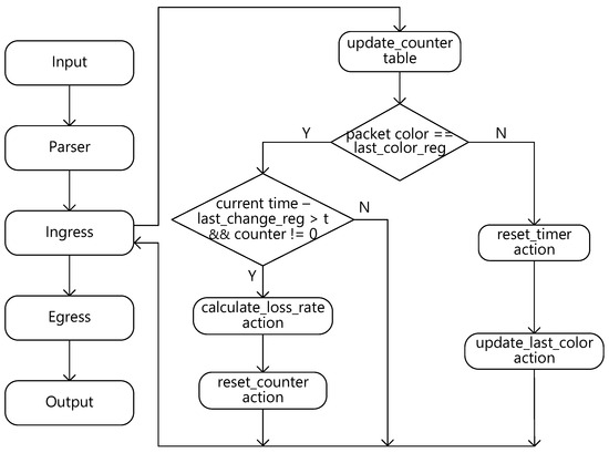If the colors are equal, the duration of continuous reception of packets with the same color is calculated by subtracting the timestamp stored in the register from the current timestamp. If this duration exceeds t, it indicates that the packets of the previous block have been fully received. In this case, the action is executed to compute the packet loss rate for the previous block. The original packet count of the previous block, defined as the smallest power of two greater than or equal to the received packet count, is calculated using shift and comparison operations. Both counts are stored in registers, enabling the controller to access them to compute the packet loss rate. After the calculation, the is executed, which resets the packet count of the previous block to prevent duplicate calculation of the packet loss rate.
