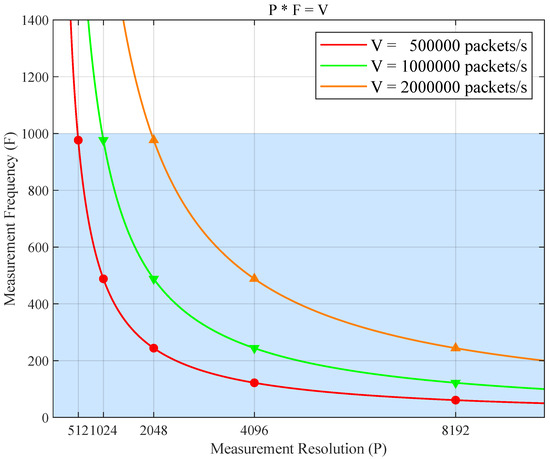 Figure 5 illustrates the inverse relationship between measurement resolution and measurement frequency under different packet transmission rates (denoted as V). The product of measurement resolution and measurement frequency remains constant and equals the packet transmission rate. This necessitates a trade-off between measurement resolution and measurement frequency, which must be dynamically adjusted in response to the current packet transmission rate. Since the block duration must exceed , there is an upper bound on the measurement frequency, which is 1000 Hz in Figure 5 as an example. Consequently, only the blue-shaded region in Figure 5 is considered valid. Moreover, since the packet count for each block must be a power of two, only the marked points in Figure 5 represent the feasible options.