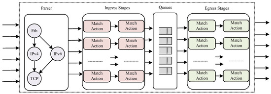 - Bosshart, P.; Daly, D.; Gibb, G.; Izzard, M.; McKeown, N.; Rexford, J.; Schlesinger, C.; Talayco, D.; Vahdat, A.; Varghese, G.; et al. P4: Programming protocol-independent packet processors. ACM SIGCOMM Comput. Commun. Rev. 2014, 44, 87–95. [Google Scholar] [CrossRef]