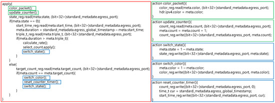 The workflow for block processing in the ingress stage is illustrated in Figure 10, with the detailed P4 program provided in Figure 11. When a packet arrives at the ingress stage, the table is applied to match the packet color and increment the corresponding counter. Subsequently, the color of the current packet is compared with that of the previous packet, which is stored in the register.