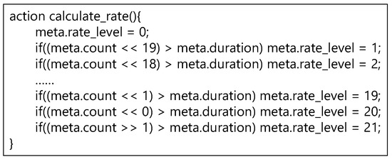If the duration exceeds , the action is executed to calculate the packet transmission rate of the egress port. This calculation is based on the current packet count and the current duration of the block being generated, which are now stored in the and fields, respectively. In P4, timestamps are recorded in microseconds, including the timestamp stored in the field. Therefore, in the action, the range of the packet transmission rate is determined using shift and comparison operations, as shown in Figure 9. The field represents the range of packet transmission rates, as illustrated in Table 3. Subsequently, the table is applied to select the target packet count for the current block based on Formula (6). The entries of the table, issued by the controller, match the and set the register to the corresponding value. Finally, the action is executed, switching the egress port state to After3t.