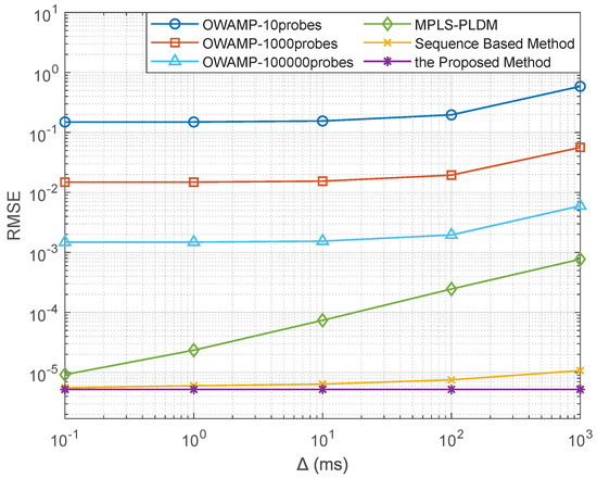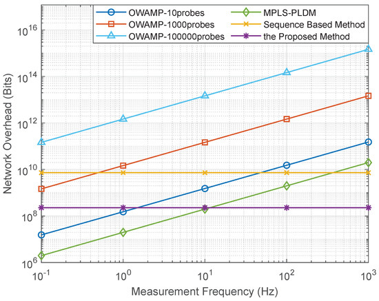 At higher measurement frequencies (above approximately 10 Hz), the proposed method maintains the lowest network overhead among all schemes. In the lower frequency range (below approximately 1 Hz), the OWAMP-10probes and MPLS-PLDM schemes exhibit lower network overheads than the proposed method. However, these two schemes exhibit reduced accuracy, especially in scenarios with packet reordering.