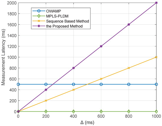 Figure 16 shows the measurement latency of these schemes at different degrees of packet reordering, which is represented by and defined as the difference between the upper and lower bounds of the one-way delay on the link. In the OWAMP scheme, a probe packet is considered lost if it is not received within a timeout threshold after being sent. Thus, the measurement latency is approximately equal to this threshold, which is negotiated between the sender and receiver before the measurement begins. This threshold typically ranges between 500 ms and 3 s, with a value of 1 s used in our simulation. In the MPLS-PLDM scheme, the counter field in auxiliary packets is used to calculate packet loss. Since the calculation is completed immediately upon the arrival of the auxiliary packet, this scheme experiences virtually no measurement latency. In the sequence-based scheme, the monitoring node estimates the packet loss rate by examining sequence numbers. To improve precision, it selects a subset of packets to calculate the loss rate. This approach requires extra observation time to ensure that the packets considered lost are not merely delayed due to reordering. The required observation time constitutes the main component of measurement latency and increases with the degree of reordering. In the proposed scheme, the packet loss rate of the previous block is calculated only when a new distinct region is recognized, resulting in a measurement latency of , where t is defined in Equation (2) and increases with the degree of packet reordering.
