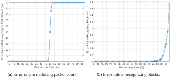 It is notable that high packet loss rates also increase the likelihood of the complete loss of all packets within a distinct region or two adjacent blurry regions. This potentially leads to errors in block recognition by the downstream node, further reducing measurement accuracy. We recorded the error rate of downstream nodes in deducing the original packet count and the error rate in block recognition as the packet loss rate increased, as shown in Figure 18a,b. These results are consistent with and validate our analysis above.