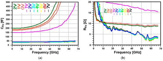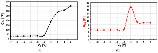 From the measurement, the extracted equivalent capacitance values, CEq, versus frequency are shown in Figure 2a. For Vg ranging from −7 V to −2 V, it is seen that the CEq values remain almost constant over all frequencies up to 20 GHz. Meanwhile, for Vg ranging from −1 V to +2 V, from 20 GHz, the CEq values start to increase exponentially due to high-frequency parasitic elements that become self-resonant at this bias voltage. More information about the extraction method can be found in [15,20].