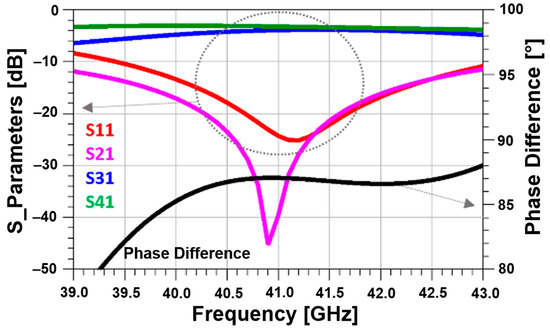 First, to design this phase shifter topology, a 3-dB 90° hybrid coupler has been designed and simulated. The Momentum-simulated layout results for the complete hybrid coupler are plotted in Figure 5. The insertion loss at port 3 and port 4 are, respectively, −0.40 dB and −0.25 dB at 41 GHz and has a maximum variation of −0.4 dB over a 2 GHz bandwidth from 40.50 GHz to 42.50 GHz. The amplitude imbalance at the center frequency is almost 0.15 dB. The phase difference between the outputs of ports 3 and 4 is about 87° at 41 GHz, while the return loss is greater than −20 dB and the isolation between the ports is greater than −25 dB. Now, the two output terminals will be loaded with the developed GaN_Lg110nm varactor small-signal model to achieve the phase shift purpose.