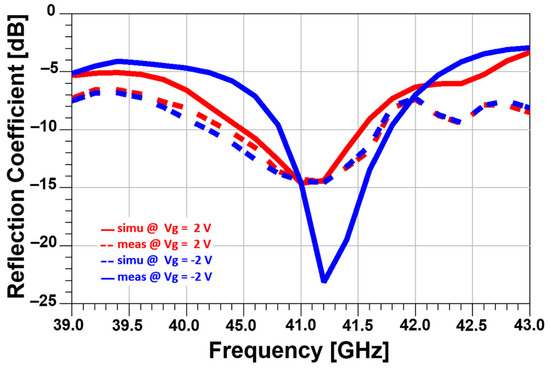 Simulated and measured reflection coefficient for Vg of 2 V and −2 V.