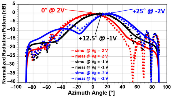 The total scan patterns of the phased antenna array at the two extreme voltages −2 V and 2 V and at −1 V are shown in Figure 11. By changing the DC bias, beam steering can be achieved since the change in this DC bias has a direct effect on the change in the phase difference between the two radiation elements. Furthermore, the main beam can be tuned continuously to different directions between 0° to 25° by adjusting the phase differences of each antenna element through the phase shifter. A side-lobe level on the azimuth plane around −8 dB is observed for a Vg of −2 V in the measurement, which is a little bit higher compared to the simulated one, which is about −9 dB. This side lobe has occurred at −2 V, which is an extreme DC bias, to achieve the CEqmax corresponding to a beam scanned at 25° (at CEqmax). This means that as the scanning angle becomes further from 0° (at CEqmin), the side lobe appears to become higher. In addition, this can be due to the diffraction of the limited size of the ground conductor and also may be due to some perturbation caused by the PADs used to connect the two varactors using the wire bonding technique.