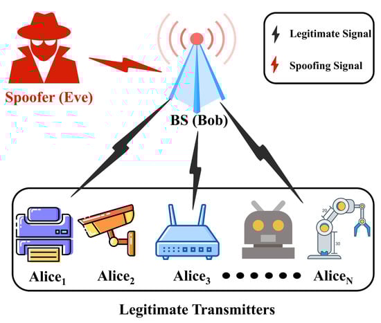 As shown in Figure 1, the classic Alice–Bob–Eve communication model is considered., in which IoT nodes (Alice1, Alice2, …, AliceN) carry out secure communication with the base station (BS) Bob. The communication between Alicei and Bob requires secure and continuous signal transmission. Bob needs to verify the received message to ascertain whether it was sent by Alicei. Eve is an illegitimate sending node, also known as a spoofer. Eve attempts to mimic the identity of a legitimate device Alicei, conducting deception through an independent spoofing channel to gain unauthorized access to the system or introduce false data. Spoofing attacks lead to unauthorized access, privacy breaches, and erroneous decisions in IoT scenarios.