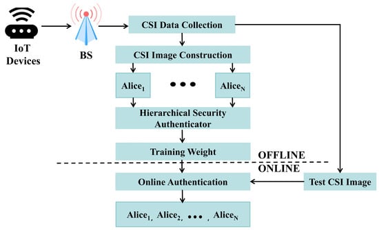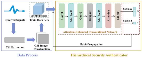 Figure 2 shows the overall framework of Hierarchical Security Authentication scheme for multi-level access control of IoT devices. During the data collection phase, BS obtains the original CSI values from the IoT devices. In the stage of converting CSI data to images, the obtained CSI data are constructed as images as input to the authenticator. The CSI matrix is considered in the form of an image, where the first channel is a real value and the second channel is a imaginary value. Considering that there are 64 antennas and 52 subcarriers in the IoT scene, the CSI matrix can be viewed as a three-dimensional image with dimensions of 64 × 52 × 2. Afterwards, the CSI image samples are input into the authenticator for training to obtain training weight. In the course of the online authentication phase, BS verifies the received data packets by making use of the trained authenticator and the recently obtained CSI image. The authenticator furnishes a prediction probability and security score, and the purpose is to ascertain the legitimacy of the data packet’s source device.