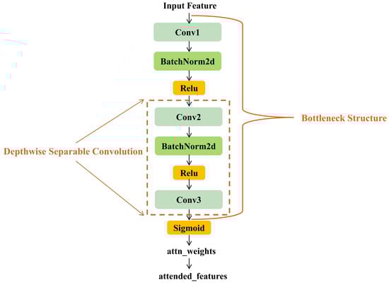 The feature map is fed into a bottleneck structure, which aims to reduce the input dimensionality of the feature while preserving crucial information. The first component of the bottleneck structure is a convolutional layer with a kernel_size of 1, which independently processes the neighborhood of each pixel, thereby reducing the number of channels in the feature map. This is followed by a BatchNorm2d layer that accelerates the training process, and its output undergoes non-linear processing through a ReLU activation function. The feature map is processed by a depth-wise separable convolutional layer, which consists of a depth-wise convolutional layer and a pointwise convolutional layer. The depth-wise convolutional layer performs spatial convolution independently for each input channel, using a kernel_size of 3. Following this layer, there is another BatchNorm2d layer and a ReLU activation function. Then, the pointwise convolutional layer transforms the output of the depth-wise convolutional layer across channels. After the bottleneck structure, a second 1 × 1 convolutional layer is utilized to adjust the number of channels. Subsequently, the features undergo batch normalization for standardization and are activated by the ReLU function to introduce non-linearity. These processed features then pass through a Sigmoid activation function, which scales their values to the range of [0, 1], representing the attn_weights for each feature location. The computed attention weights attn_weights are utilized to enhance the feature representation of the input feature maps x. This is achieved by performing an element-wise multiplication between the attention weights and the original input feature maps: