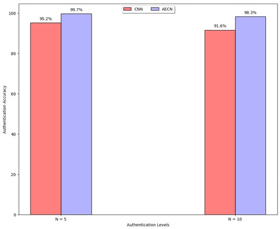 Figure 6 illustrates the authentication accuracy of the CNN and AECN with a authentication levels fixed at 5 and 10, respectively. At the authentication level of 5, the authentication accuracy of the CNN is 95.2%, while that of the AECN is 99.7%, representing a 4.5% increase in accuracy compared to the CNN. Upon raising the authentication level to 10, the authentication accuracy of the AECN remains at 98.3%, although this is lower than at the authentication levels of 5. In contrast, the authentication accuracy of the CNN is 91.6%. This demonstrates that our proposed attention mechanism module is capable of maintaining excellent authentication accuracy when the security authentication level increases.