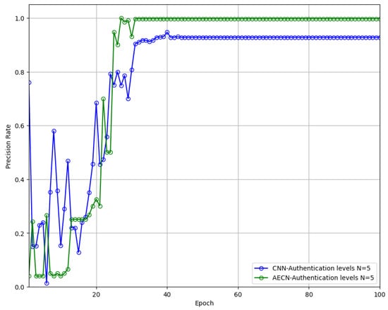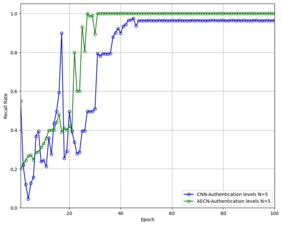 Figure 8 illustrates the recall rates of the CNN and AECN models with the authentication level fixed at 5. As the number of epochs increases, the recall rate of the AECN shows a consistent upward trend. Prior to the 20th epoch, the recall rate of the CNN exhibited significant oscillation. In terms of convergence speed, the AECN outperformed the CNN, converging more quickly. As the epochs increase, the recall rate of the AECN approaches 1, while the CNN converges at 96.3%. This indicates that our proposed AECN model demonstrates enhanced performance in distinguishing legitimate users.