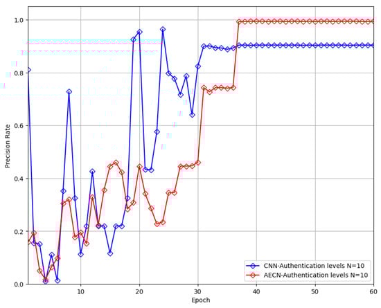 Figure 9 and Figure 10 illustrate the precision and recall rates for an authentication level of 10, respectively. Figure 9 shows that, during the initial 30 epochs, the CNN model experiences greater oscillations, ultimately converging at a precision rate of 90.4%. In comparison, the AECN model exhibits relatively minor fluctuations in its precision rate, eventually reaching a value of 99.3%. Throughout the training process, the precision rate of the AECN remains stable, showing no significant upward or downward trend. This suggests that the AECN model is better able to maintain its generalization ability.